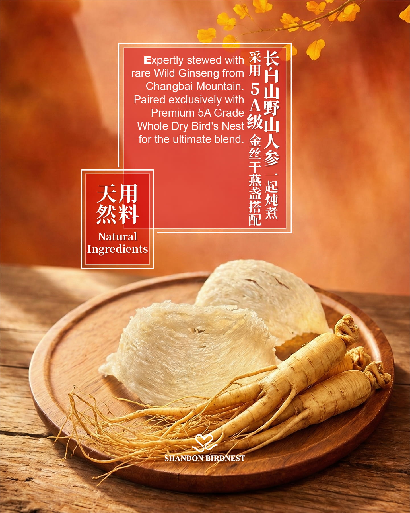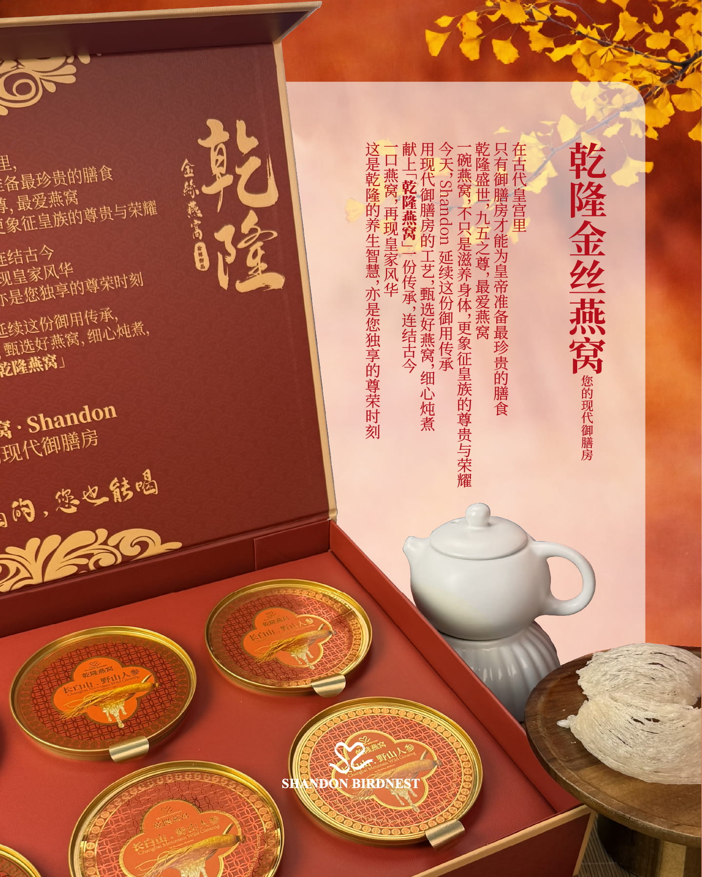 - High-pressure stewed 5A-grade whole bird’s nests with rare wild Changbai Mountain ginseng to lock in freshness and nutrition.